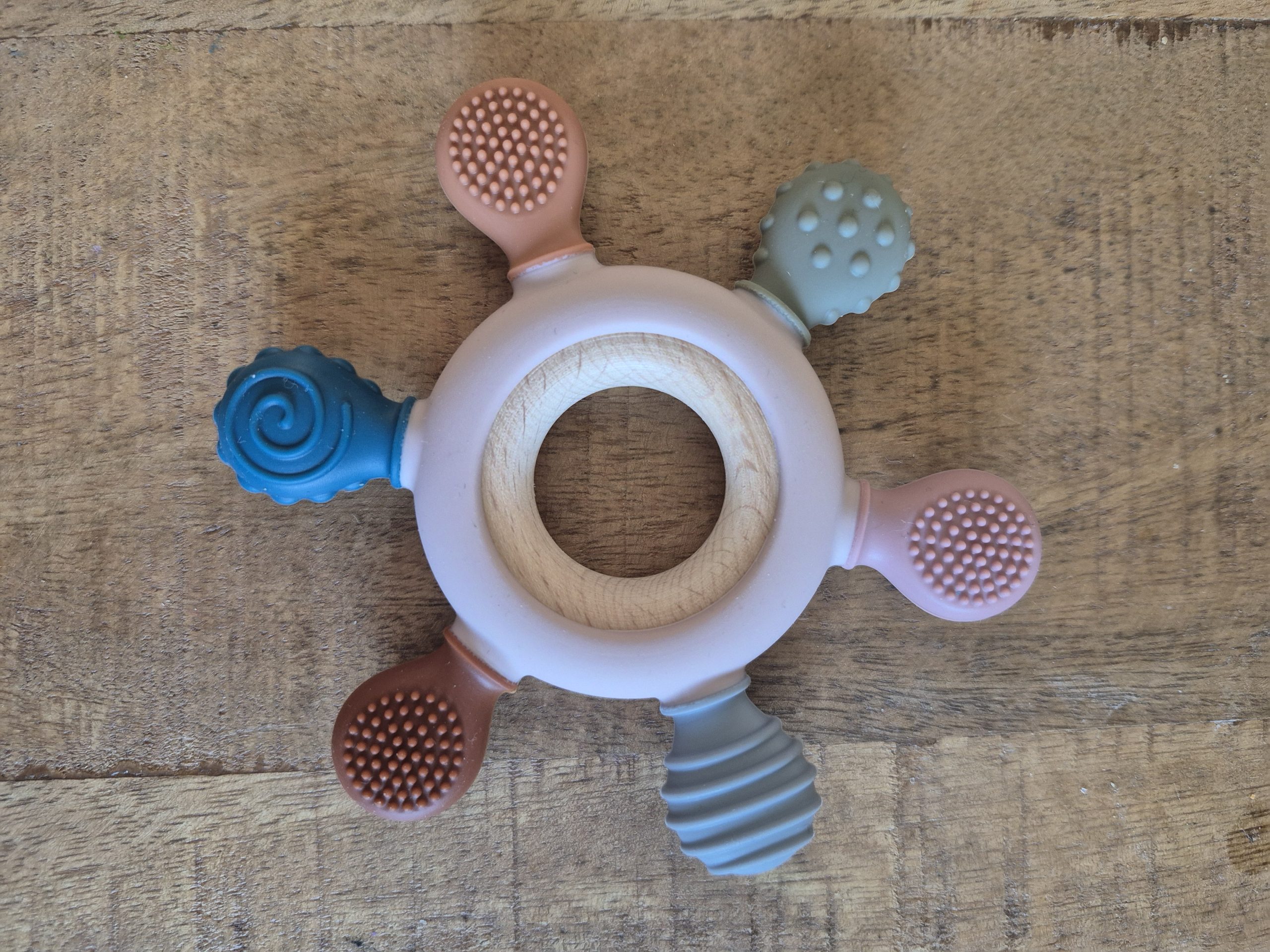 Deze siliconen bijtring is een veilig en flexibel speeltje voor baby’s, ontworpen om hun tandjes te verzachten tijdens het doorkomen. Het is zacht voor het tandvlees en kan het in verschillende vormen en kleuren komen. De bijtring is licht van gewicht en makkelijk vast te houden voor kleine handjes. Veel modellen zijn ook eenvoudig schoon te maken, wat hygiëne bevordert. Sommige bijtringen hebben zelfs texturen of functies die extra stimulatie bieden voor de zintuigen van je baby
