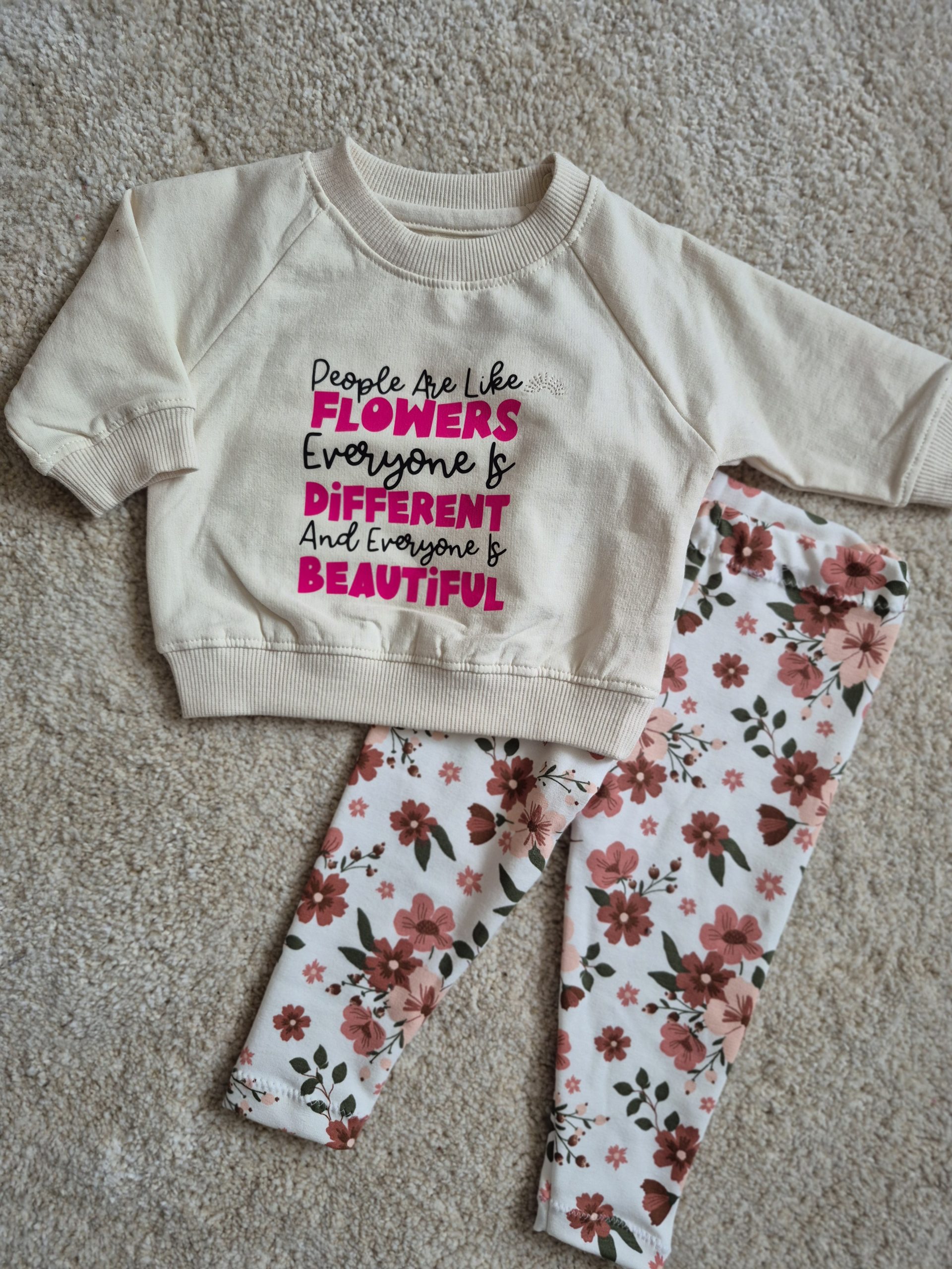 ‘People are like Flowers’  De tekst zegt genoeg. Dit leuke setje is op allerlei manieren te combineren. Nu te verkrijgen in maat 62.